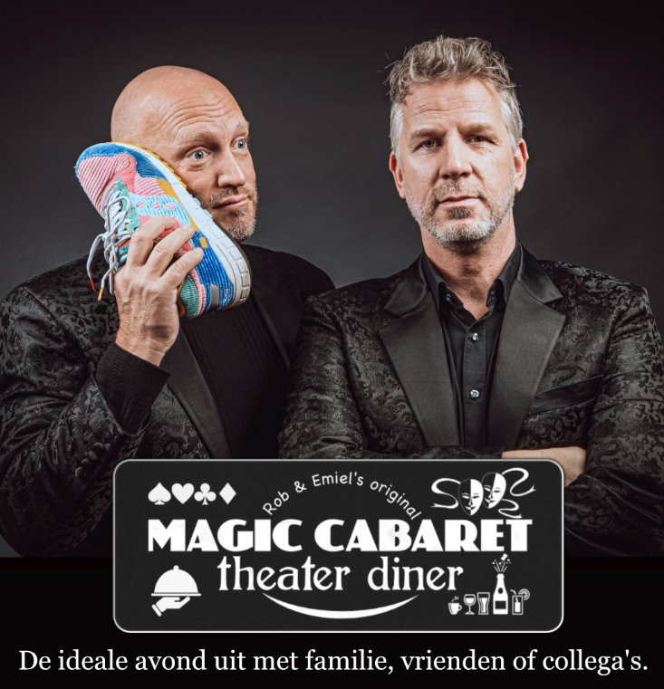 Laat je betoveren tijdens het Magic cabaret theater diner, waar een onvergetelijke ervaring op je wacht! Geniet van een spectaculaire mix van cabaret, magie en stand-up comedy, gecombineerd met een verrukkelijk 5-gangendiner. Rob en Emiel zorgen voor een show die al je zintuigen prikkelt en je niet snel zult vergeten.