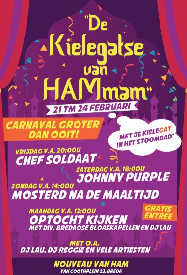 Dit jaar viert Nouveau van Ham carnaval groter dan ooit! 4 dagen feest met verschillende dj's en artiesten bij van HAMmam! Met dit jaar een grote en verwamde tent met garderobe. En de toegang is ook nog eens helemaal gratis, tijd voor een feestje dus!