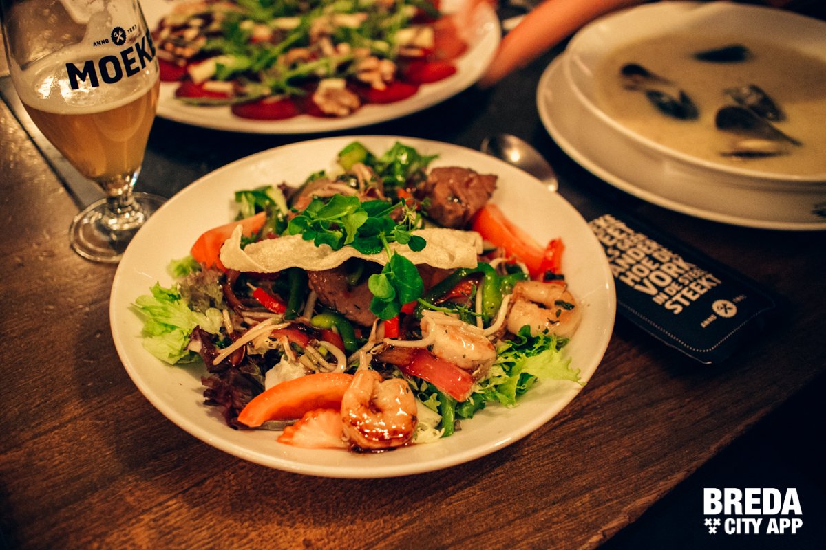 De salade Moeke is een verrukkelijke oosterse salade met botermalse medium gegrilde ossenhaaspuntjes en gewokte gamba’s. Verschillende soorten sla met grof gesneden rauwkost en taugé wordt afgemaakt door een smaakvol sausje met een Oosters tintje.