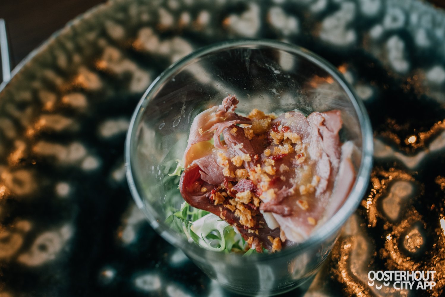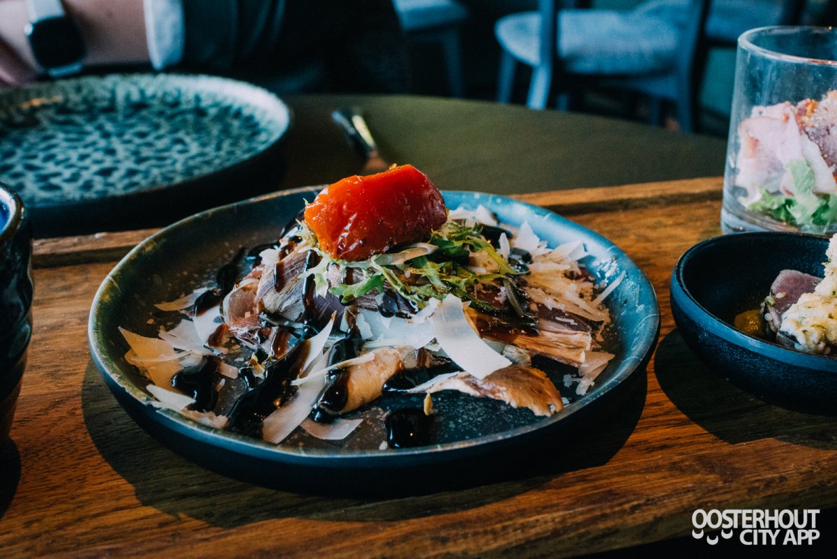 Daarnaast krijgen we gerookte eendenborst met frisé en sinaasappelglaze, een gedroogde ham (cecina de león) met Parmezaan en zongedroogde tomaat én tonijn tataki met avocadocrème en Japanse mayonaise. We genieten van al het lekkers van de eerste plank en zijn erg benieuwd naar de volgende gangen!