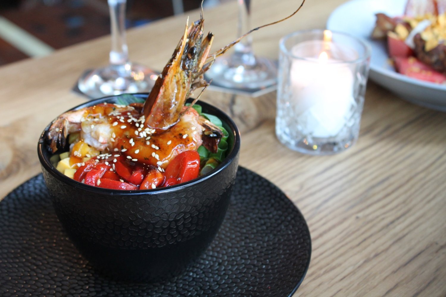 Ik kies voor de Poké Superbowl met gamba's, noodels, gerookte paprika, wortel, lente uitjes en courgette. De Poké bowls kan je ook een maatje groter als hoofdgerecht bestellen maar de kleine bowl is een erg lekker voorgerecht en prima van formaat. De garnalen zijn goed gekruid en de combinatie met de courgette en de paprika is heerlijk. De ribbetjes zijn ook al zo'n succes. Door de bereiding in de broiler is de buitenkant mooi bruin door de gekarameliseerde vetten en is het vlees zo mals dat het van het bot af valt. De combinatie van meloen met feta maakt het fris en niet te zwaar als voorgerecht. En inderdaad, Dutch Glory smaakt er goed bij!