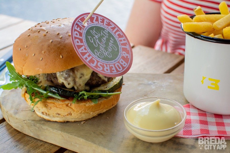 Om een stevige bodem te leggen kiezen we daarna voor de boerschappen burger: deze bestaat uit allemaal lokale streekproducten! Het vlees komt van de galloway koeien, die onder andere in de Haagse Beemden staan te grazen. Er wordt ons verteld dat de koeien veel beweging krijgen in de grote wei, waardoor het vlees lekkerder en wat zoeter is. Ook de groente (courgette) komt uit omstreken Breda, en dit geldt ook voor de kaas. Dit is natuurlijk fantastisch met het oog op duurzaamheid: doordat alles uit de buurt komt, vindt er ook nog eens minder CO2 uitstoot plaats!