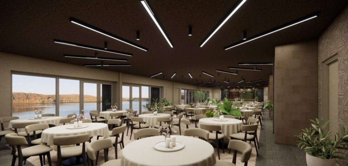De bovenverdieping bestaat straks uit vier afzonderlijke zalen die zowel apart als gecombineerd gebruikt kunnen worden. Daardoor kan de locatie eenvoudiger inspelen op zowel kleinere vergaderingen als grotere bijeenkomsten. Het dakterras vormt een extra troef: een sfeervolle plek voor recepties, borrels of pauzemomenten met een uniek uitzicht over het meer.