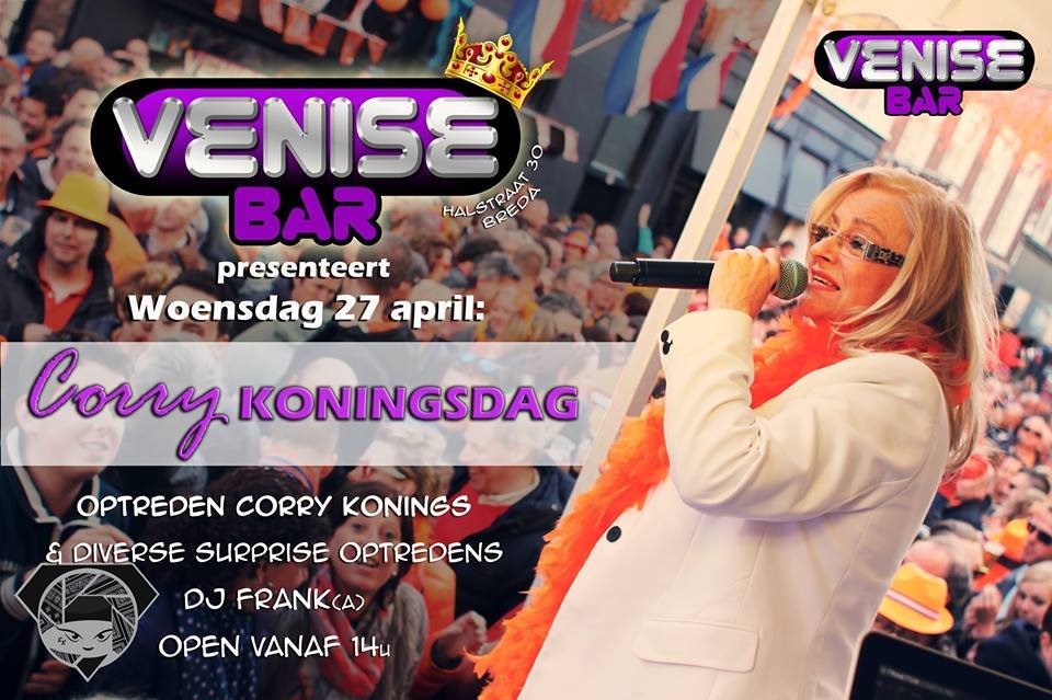 De Venise bar organiseert op 27 april de Corry Koningsdag. Naast Corry Konings zullen er verschillende artiesten optreden, het evenement start om 14:00 uur.